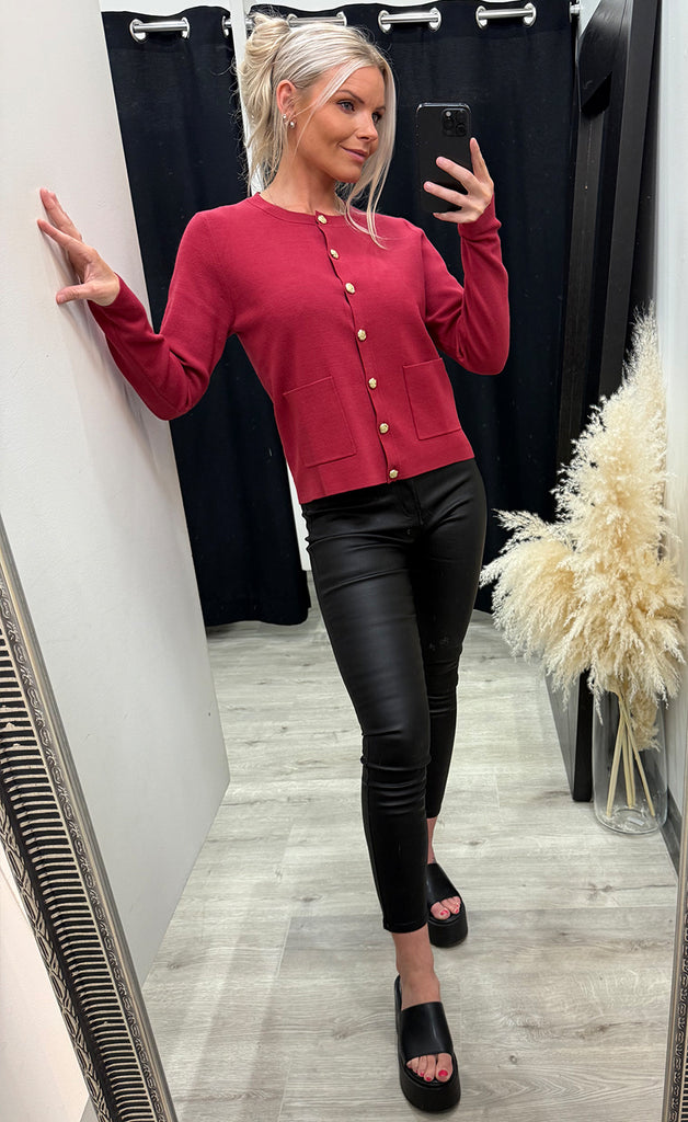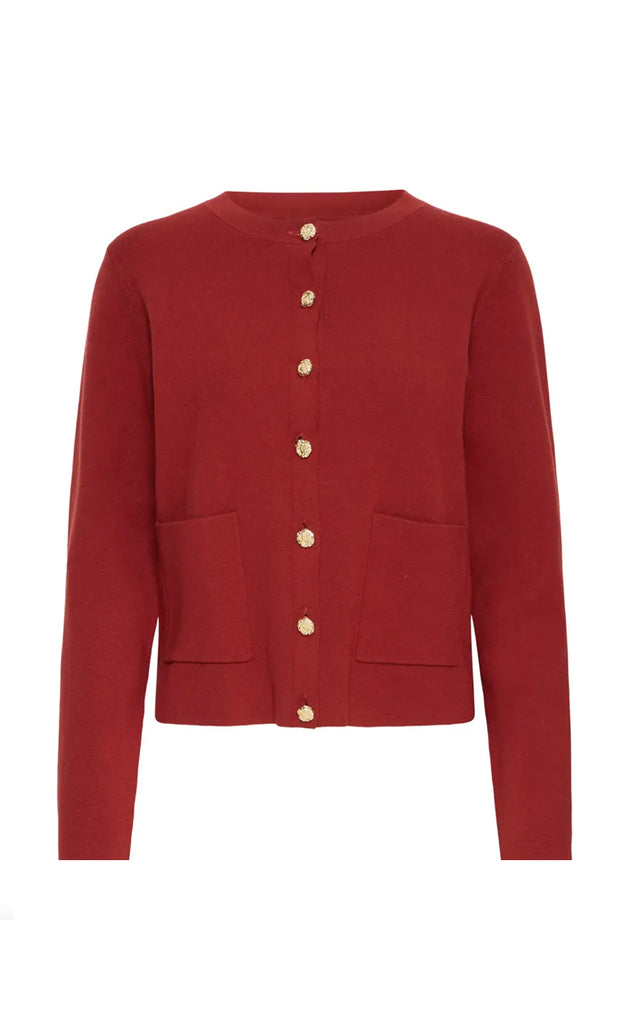 Ótrúlega falleg peysa frá danska merkinu PULZ. Peysan er úr mjúku og teygjanlegu efni og hneppt niður með gylltum tölum. -Módel notar stærð 36/38 og er 168 cm á hæð og er í stærð XS