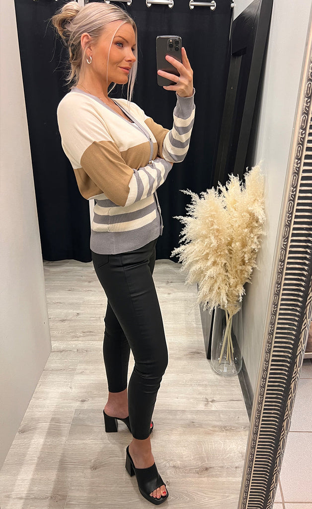 Peysan er úr mjúku og teygjanlegu prjónaefni og hneppt niður.