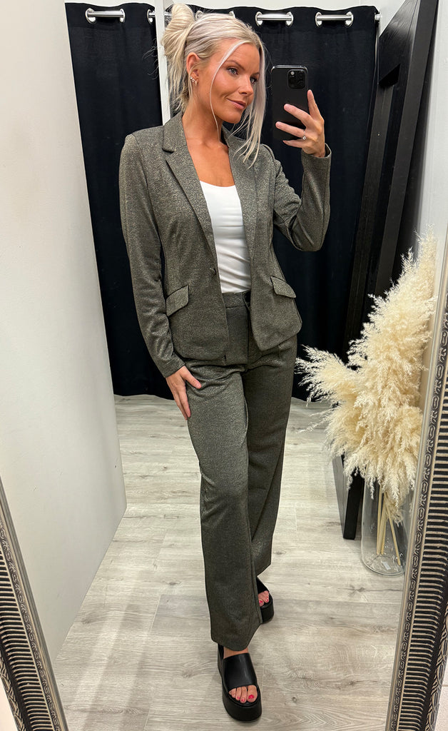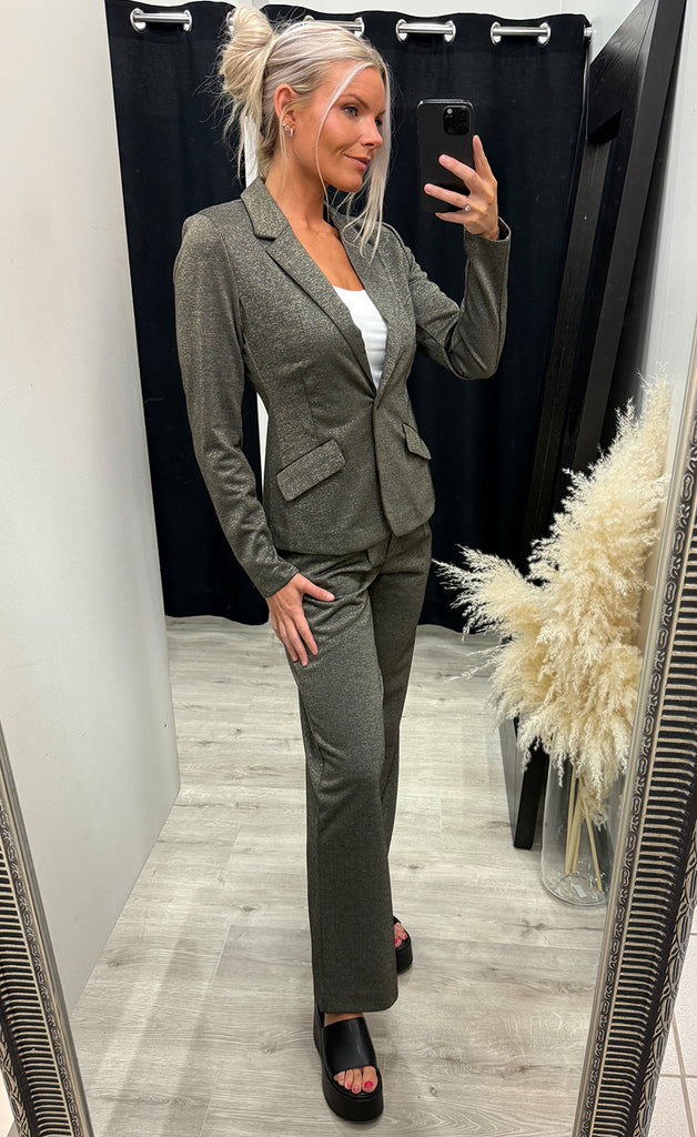 Jakkinn er úr mjúku og teygjanlegu efni, hnepptur og með gylltum lurex glansþræði.