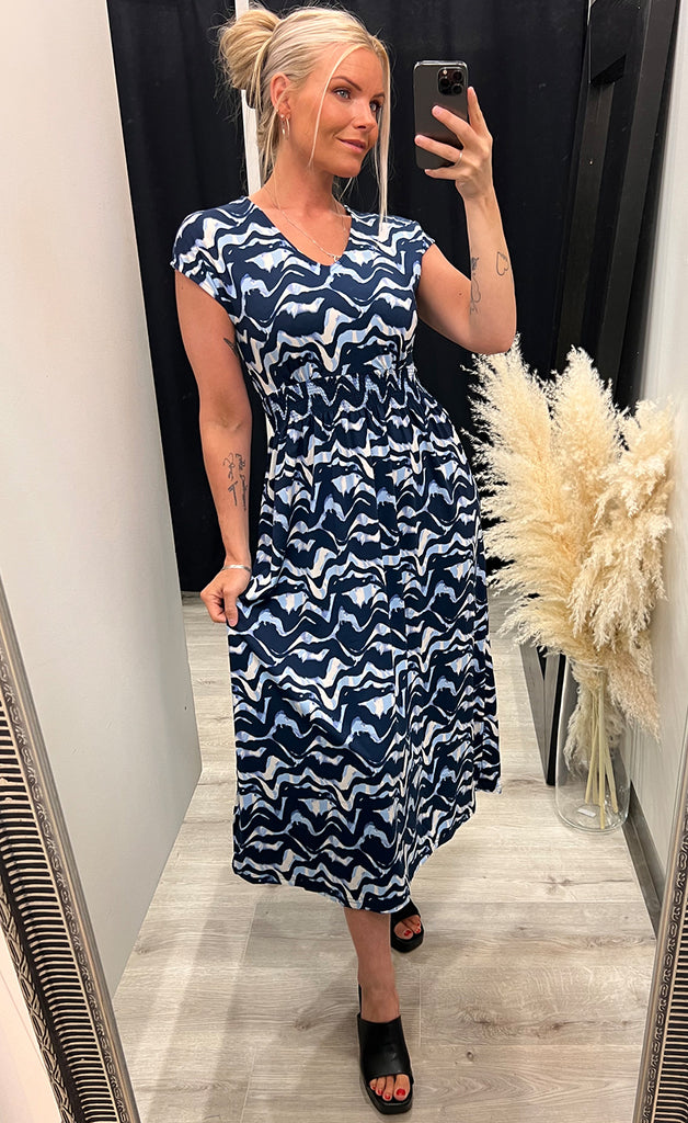 Kjóllinn er úr mjúku og teygjanlegu efni og með teygju undir brjóst.