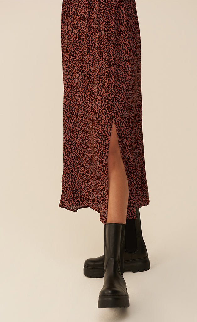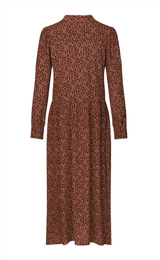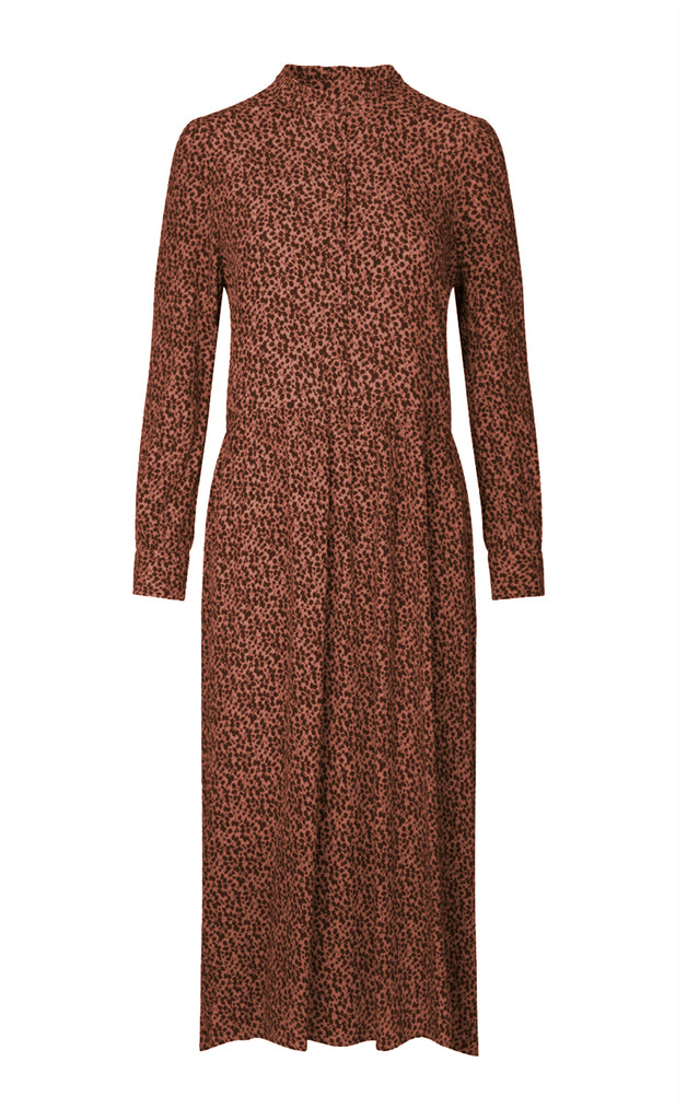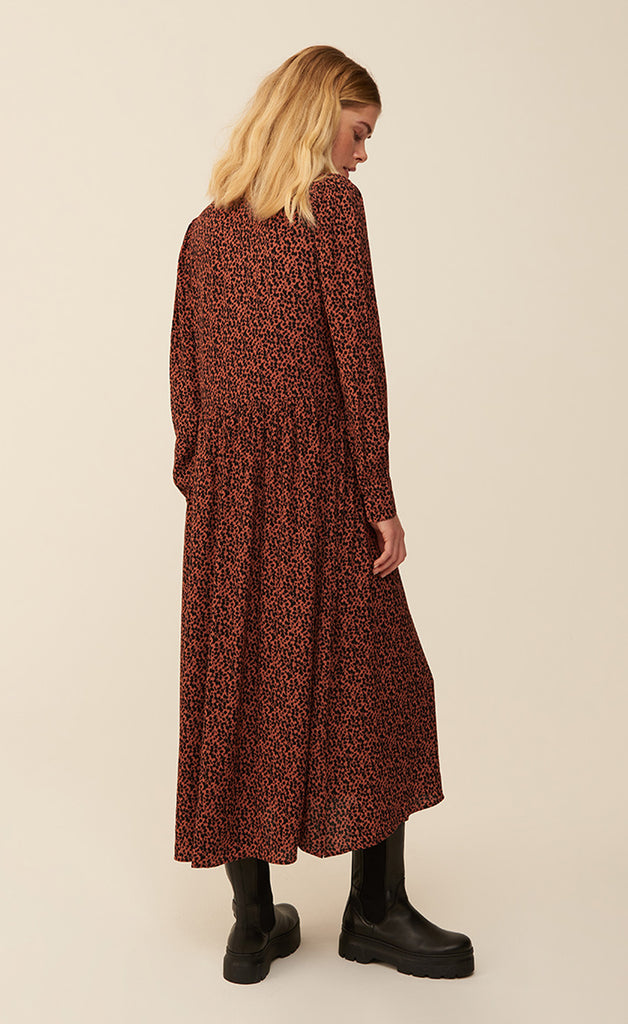 Kjóllinn er hnepptur niður í mitti, með víðu pilsi og klauf á hliðum.