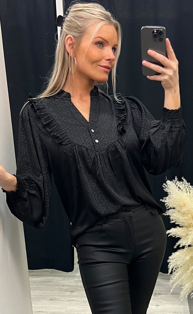 Blússan er úr flottu satín efni, hneppt að ofan og með flottu pífu detail.