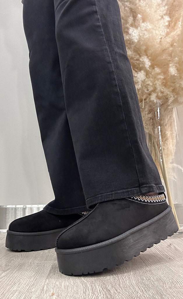 Geggjaðir loðfóðraðir skór með opnum hæl.