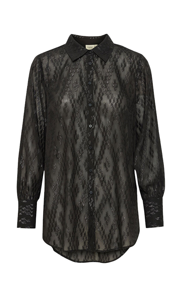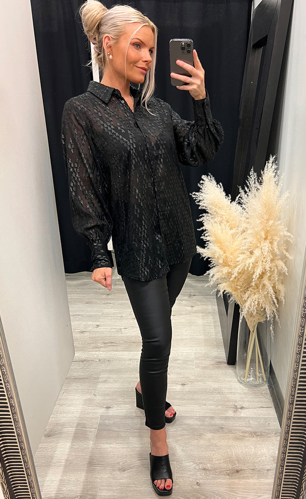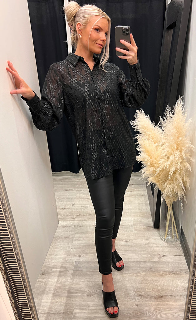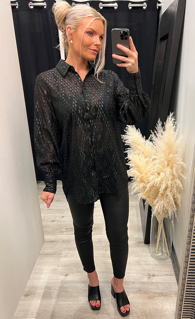 Skyrtan er með kraga, hneppt niður og með lurex glansþræði.