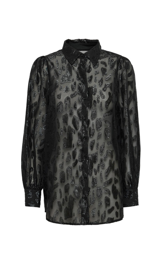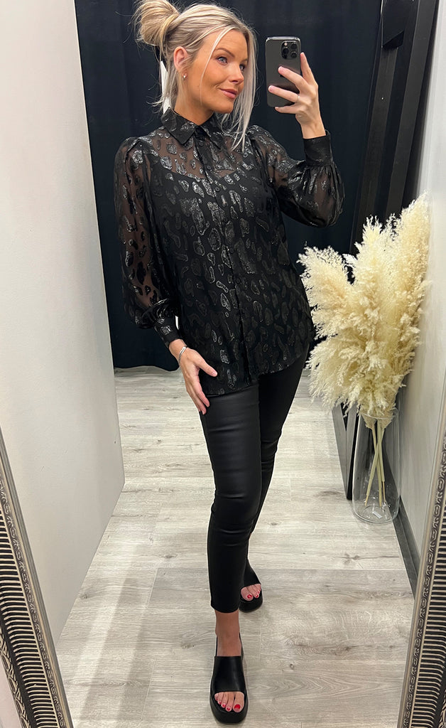 Skyrtan er úr léttu siffon efni, með kraga, hneppt niður og með lurex glansþræði.