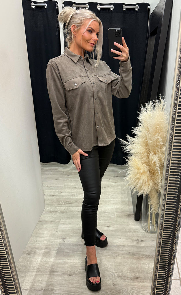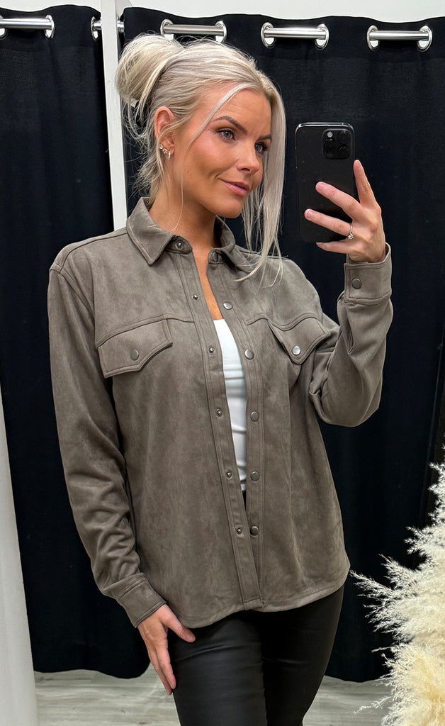 Skyrtan er úr mjúku efni, með kraga og lokuð niður með smellum.
