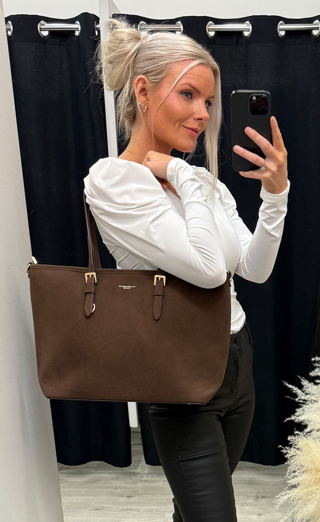 Ótrúlega falleg taska úr flottu rúskinlíki.Taskan er með einu stóru tvískiptu hólfi og minna hólfi að aftan.-Lengri töskuól fylgir með