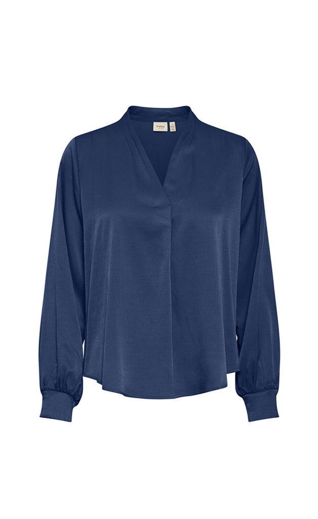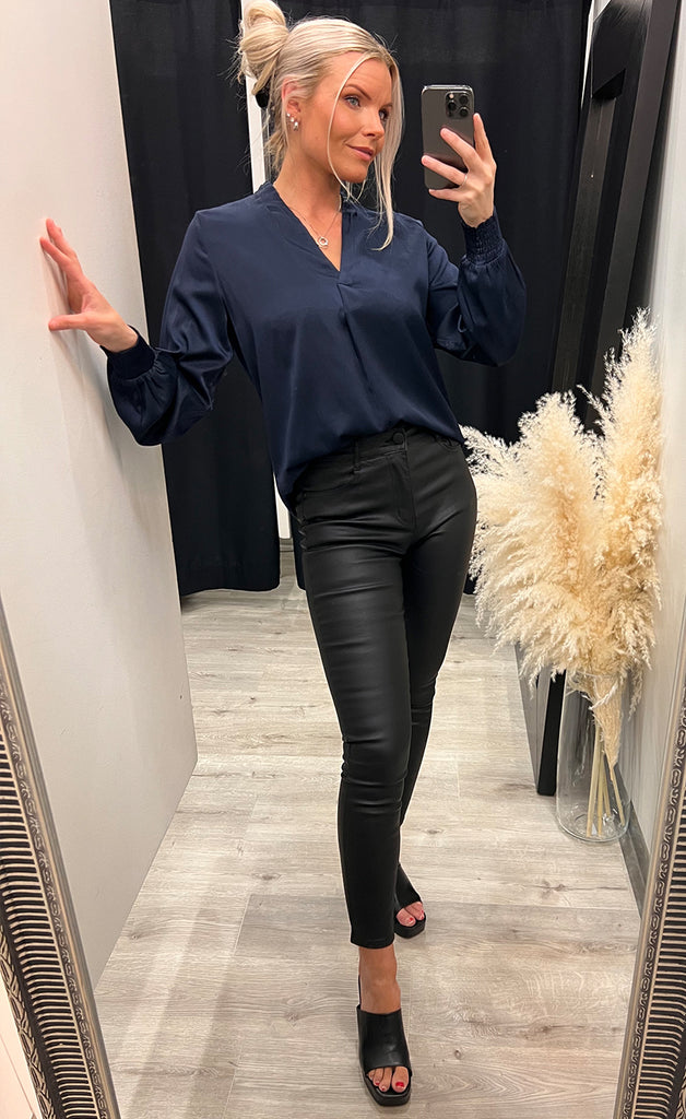 Blússan er úr flottu efni, með v-hálsmáli og með teygju framan á ermum.