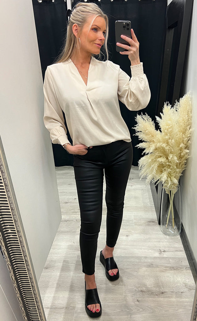 Blússan er úr flottu satín efni, með v-hálsmáli og teygju framan á ermum.