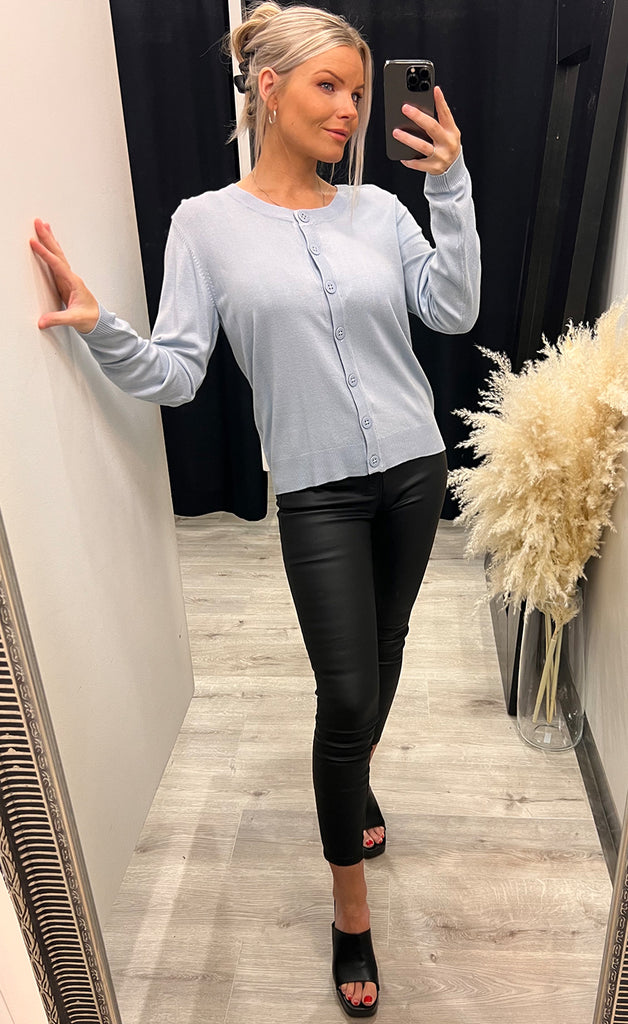 Peysan er hneppt niður og úr mjúku og teygjanlegu prjónaefni.